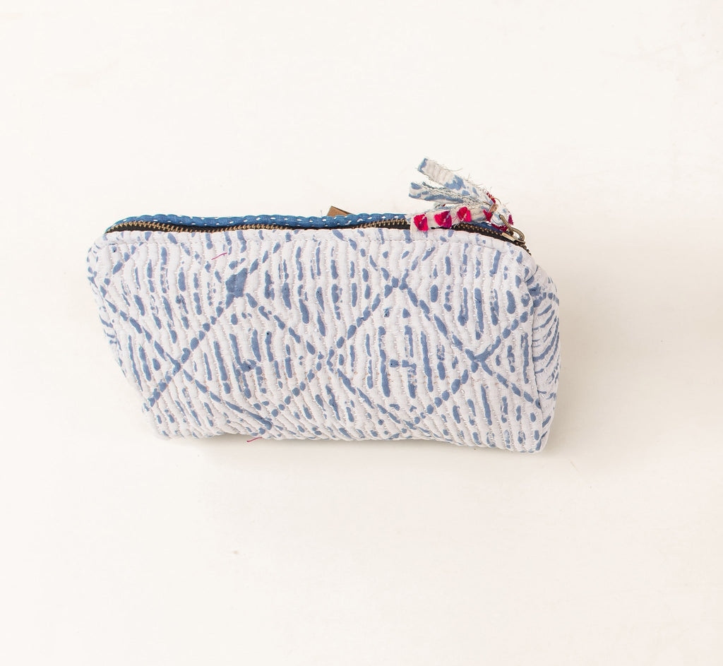 Details: Material: 100% vintage sari fabric (white/cream with block print), Size: 17 × 25 cm, Closure: durable zipper, Origin: handmade in India