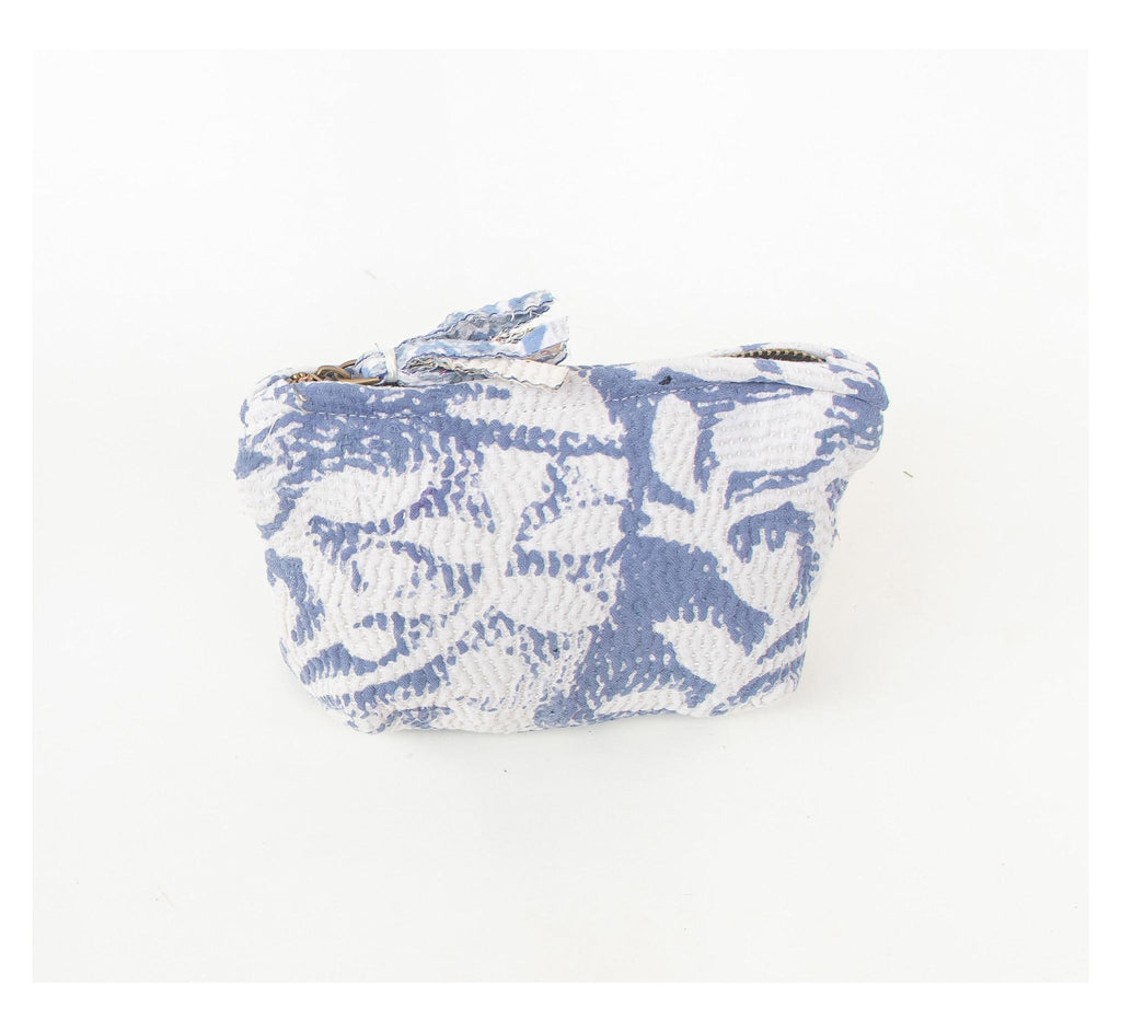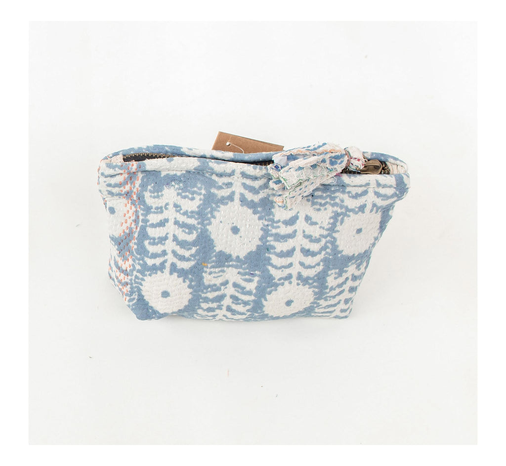 Details: Material: 100% vintage sari fabric (white/cream with block print), Size: 12 × 20 cm, Closure: durable zipper, Origin: handmade in India