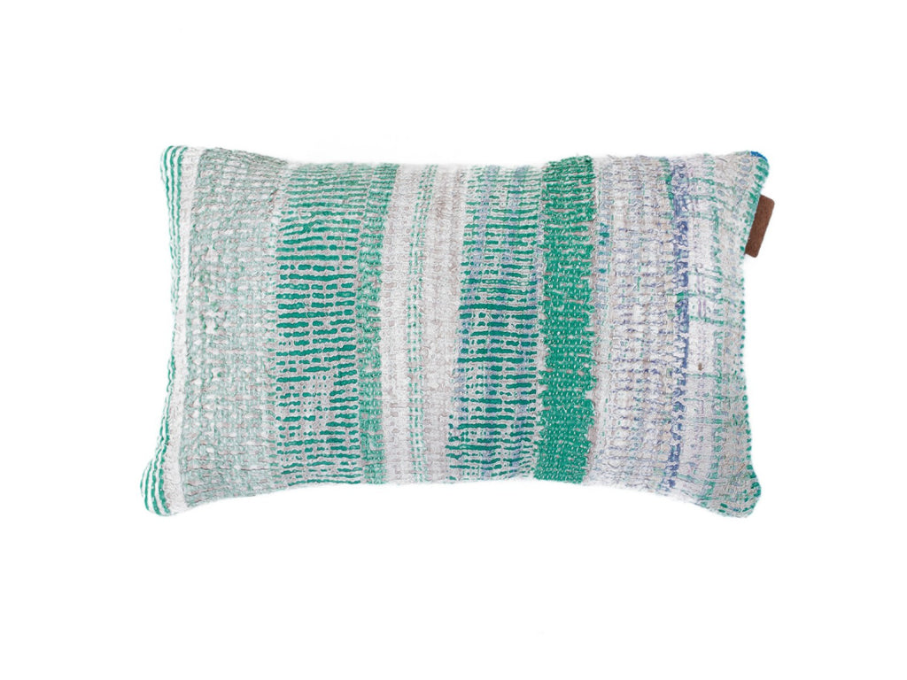Fine Q are Sari cushions produced from a type of sari that has a different expression than our normal Sari Kantha cushions. They are made of thick recycled cotton sari laid together with several layers in between and with a worn look, where the saris inside help to give the whole pillow a very raw vintage look. They are toned down in colors and patterns and are sewn with smaller and tighter Kantha stitches, which give them an authentic look..